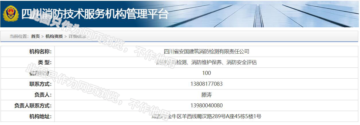 四川省安國建筑消防檢測有限責任公司 地址:成都市武陽大道一段288號中央花園城市別墅一期1棟28號